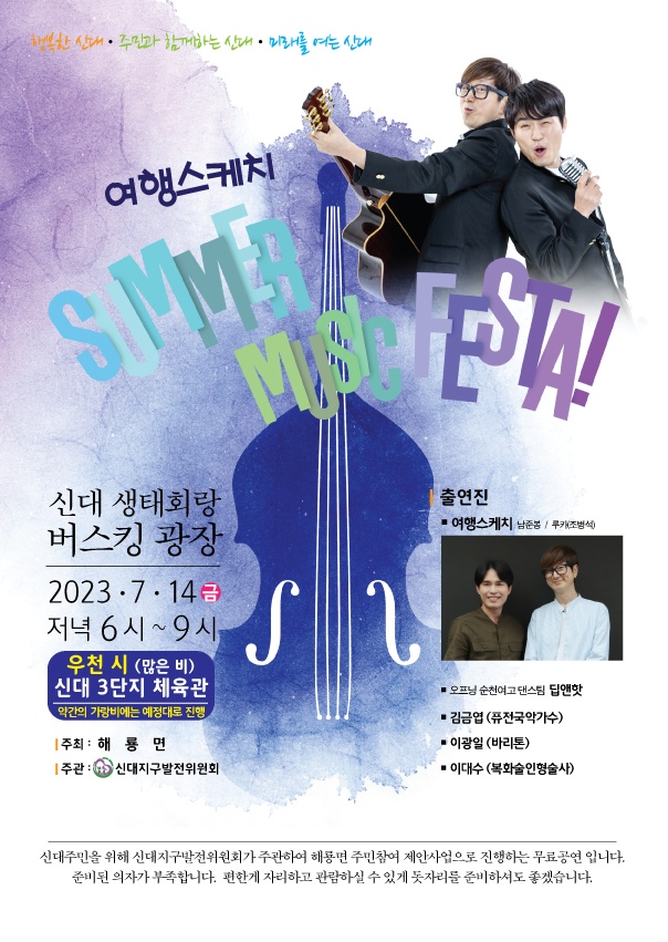 순천시 해룡면이 주최하고 신대지구 발전위원회가 주관하여 개최하는 신대 생태회랑 힐링 버스킹 공연이 오는 14일 생태회랑 버스킹 공연장에서 오후 6시부터 9시까지 개최된다.