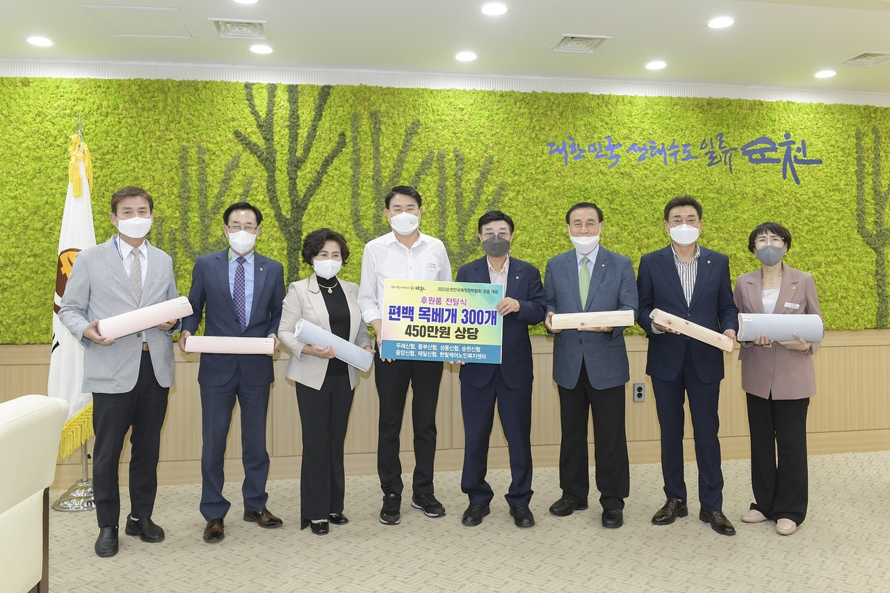 순천시(시장 노관규)는 지난 21일 시장실에서 7개 기관 대표가 참석한 가운데 경로당 어르신들을 위한 후원물품(편백 목베개) 전달식을 가졌다.