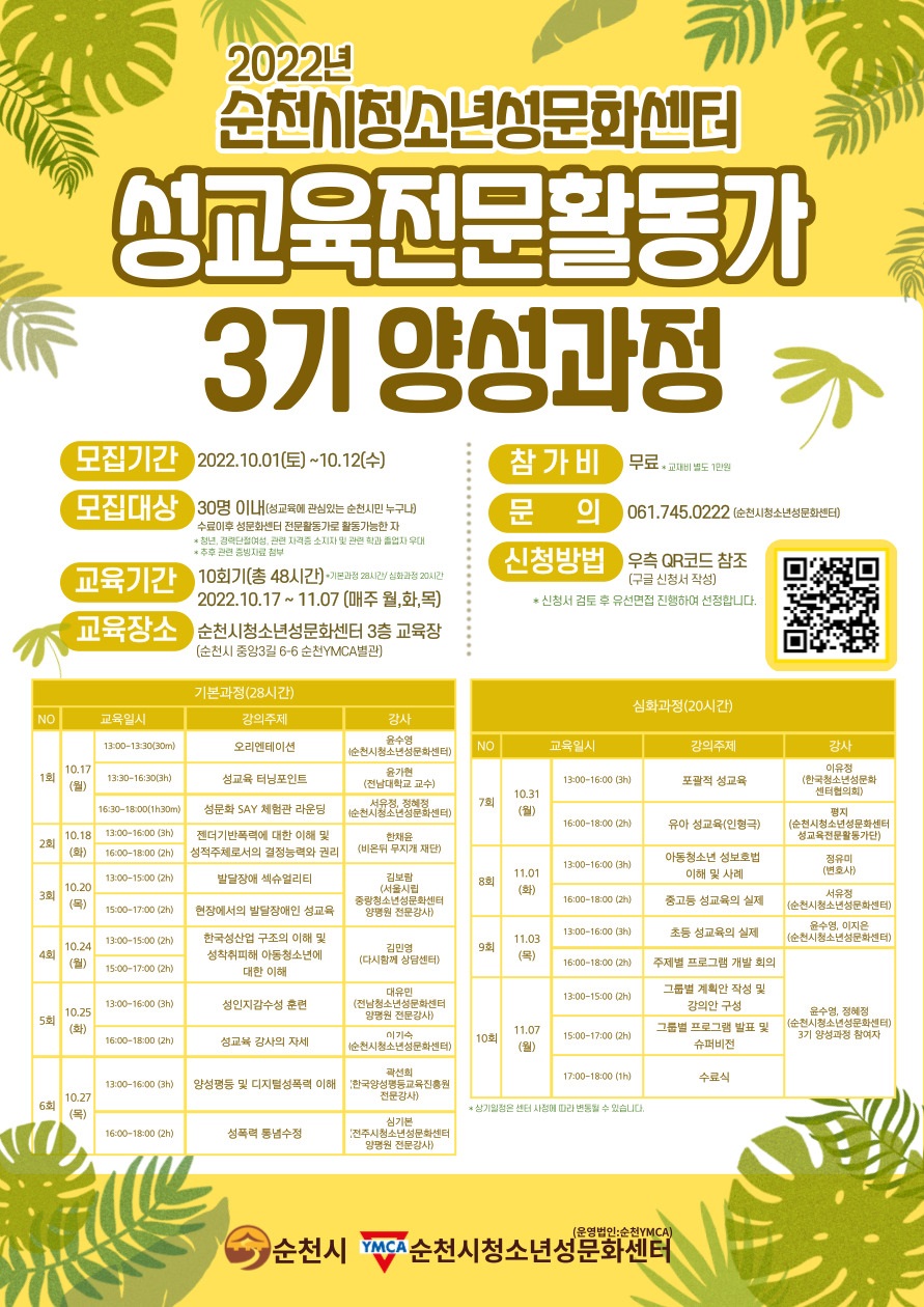 순천시청소년성문화센터는 오는 12일까지 성교육전문활동가 양성과정 3기 참여자를 모집한다.