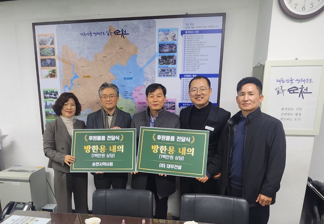순천시(시장 노관규)는 26일 순천시약사회(회장 양찬희)와 ㈜대우건설(소장 김학신)에서 각각 1백만 원 상당, 28일 골드클래스(소장 김준철)에서 4백만 원 상당의 ‘겨울 내의’를 지역 독거 어르신을 위해 기부했다고 밝혔다.