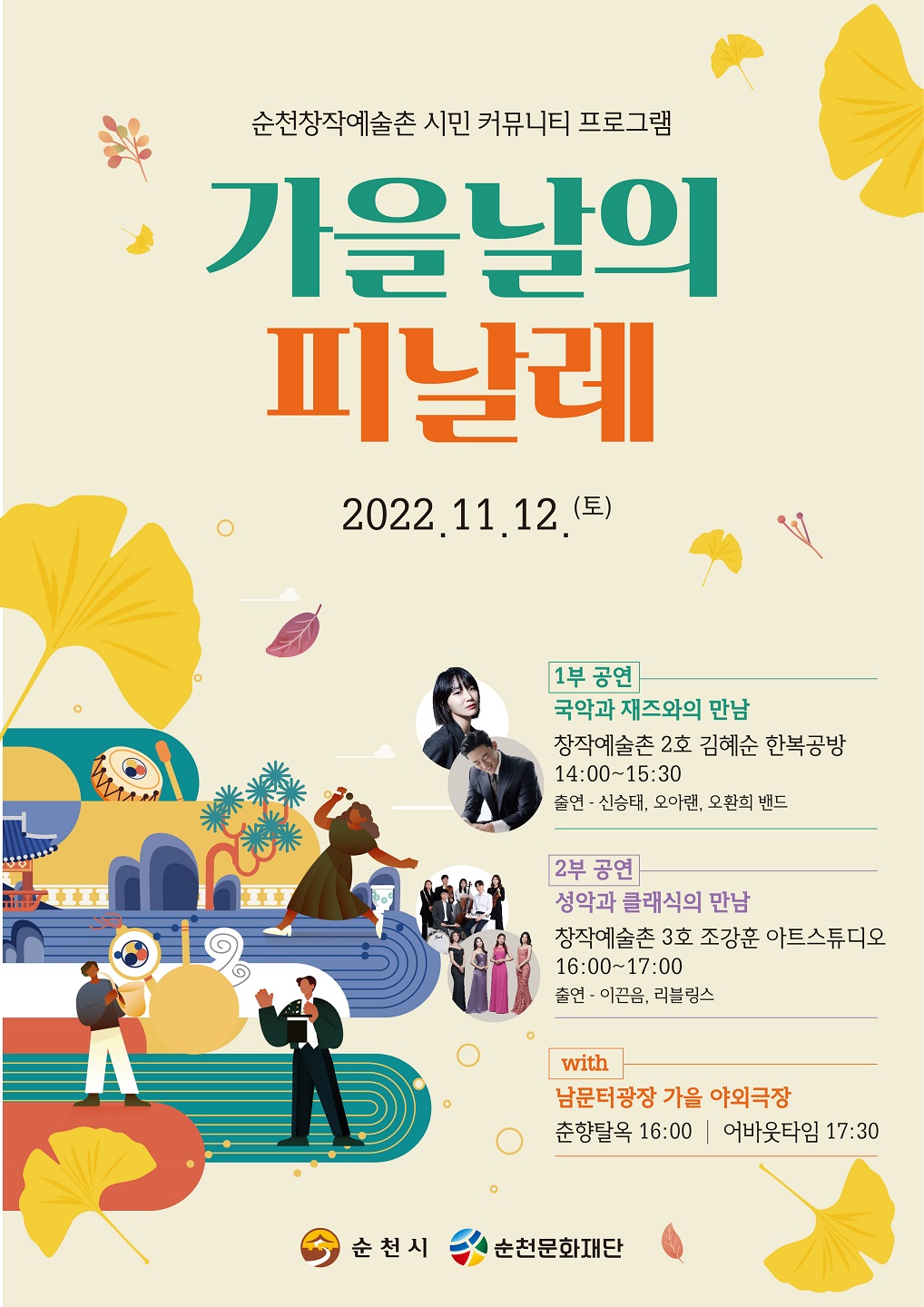 순천시가 주최하고 (재)순천문화재단이 주관하는 ‘가을날의 피날레’문화 공연이 오는 12일 오후 2시에 창작예술촌 2호 김혜순 한복공방 마당에서 열린다.