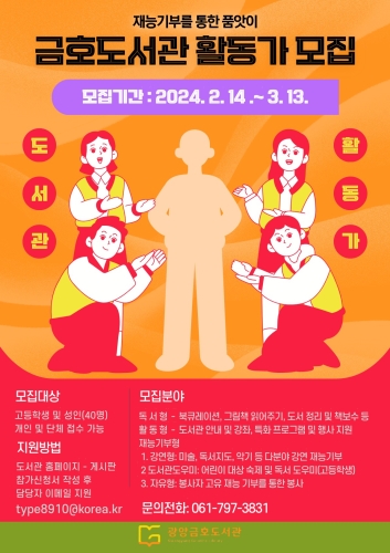 광양시 광양금호도서관은 오는 14일부터 자원봉사활동을 통해 도서관과 함께 성장할 「도서관 활동가」를 모집한다...