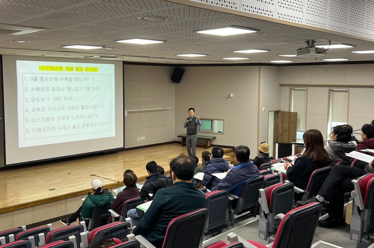 이번 교육은 샤인머스캣 포도의 고품질 생산을 위해 재배 포인트를 300평당 2톤 이상의 수량을, 당도는 18브릭스 이상으로 맞춰서 9월 중순 안에 수확하도록 목표를 잡고 시기별 토양 시비 관리와 물관리 요령에 대해 중점적으로 진행했다.