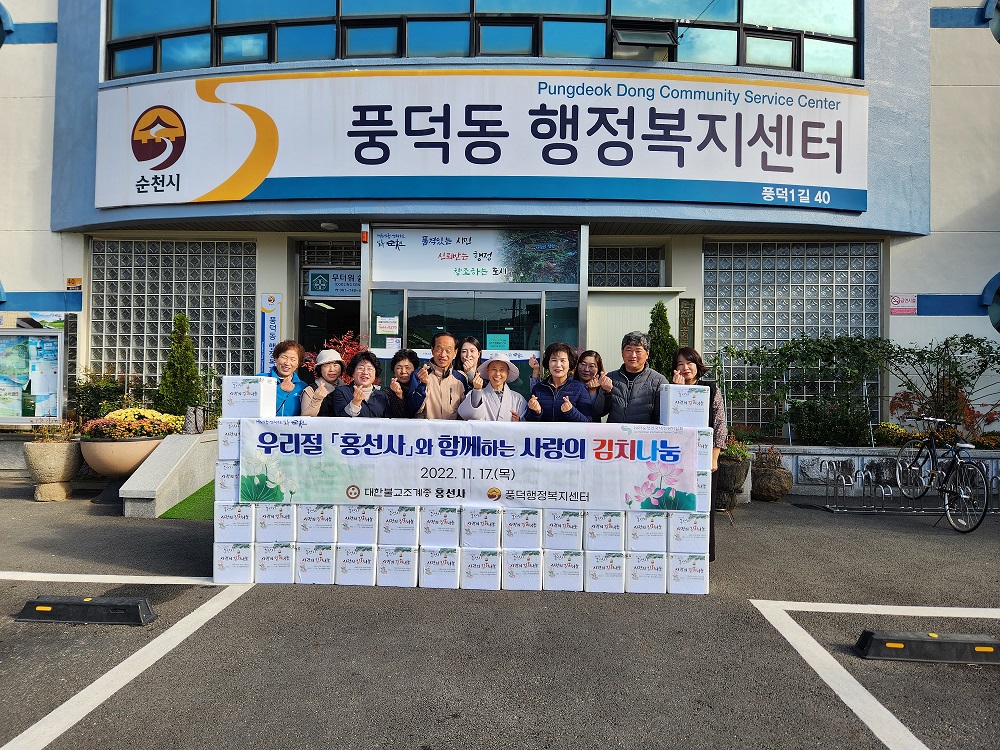 순천시 풍덕동은 지난 17일 대한불교조계종 홍선사(주지 법영스님)가 기부한 김장김치(5kg) 50박스(250만원 상당)를 관내 취약계층과 독거노인 50세대에 전달했다.