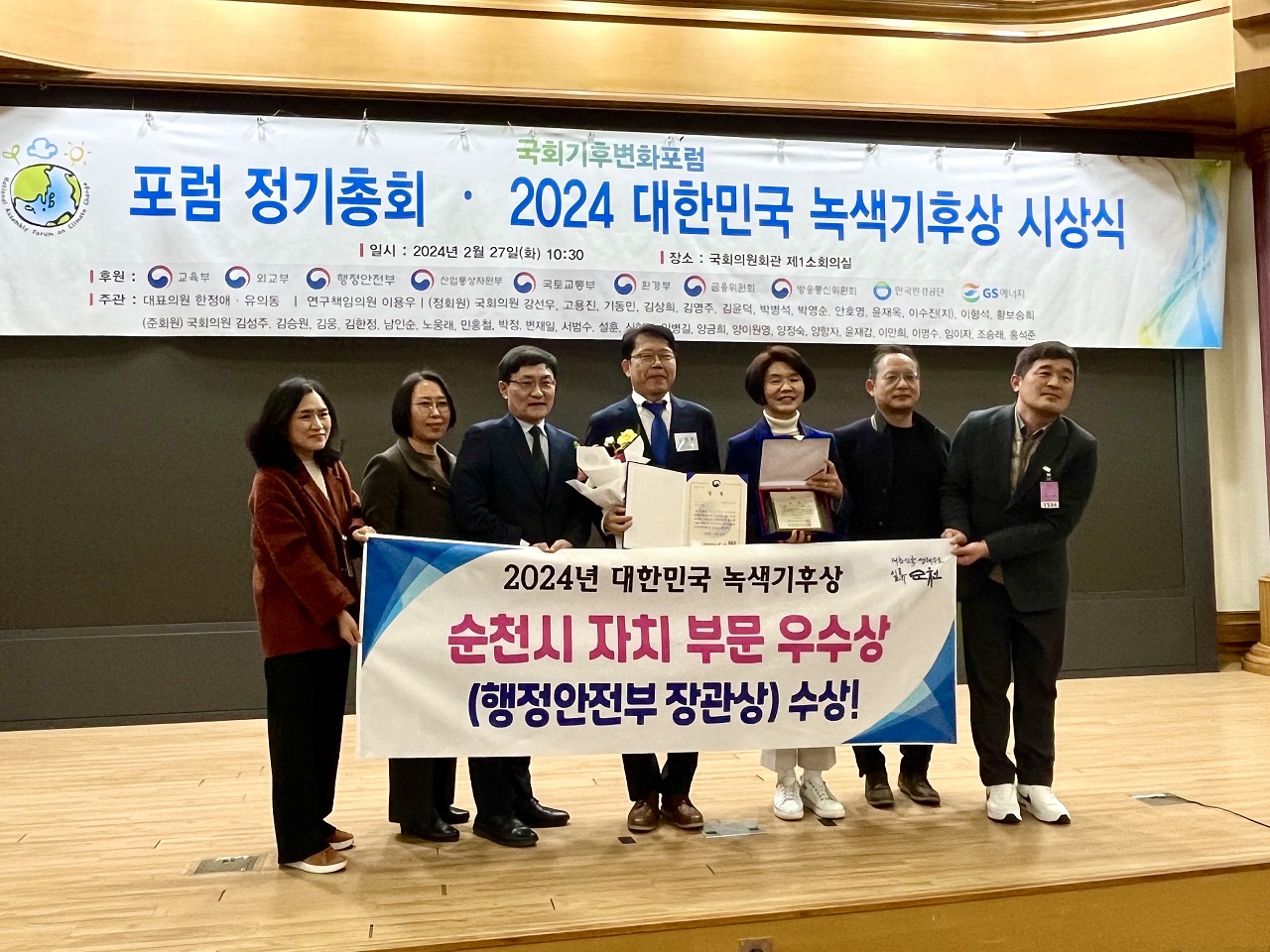 순천시(시장 노관규)는 27일 국회 국회의원회관에서 열린 ‘2024년 대한민국 녹색기후상’ 시상식에서 행정안전부 장관상을 수상했다고 밝혔다.