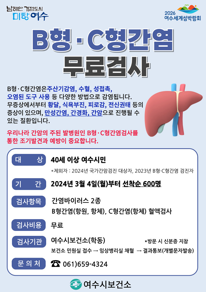 여수시(시장 정기명)가 3월부터 만 40세 이상 시민 600명을 대상으로 B형, C형간염 무료검사를 실시한다.