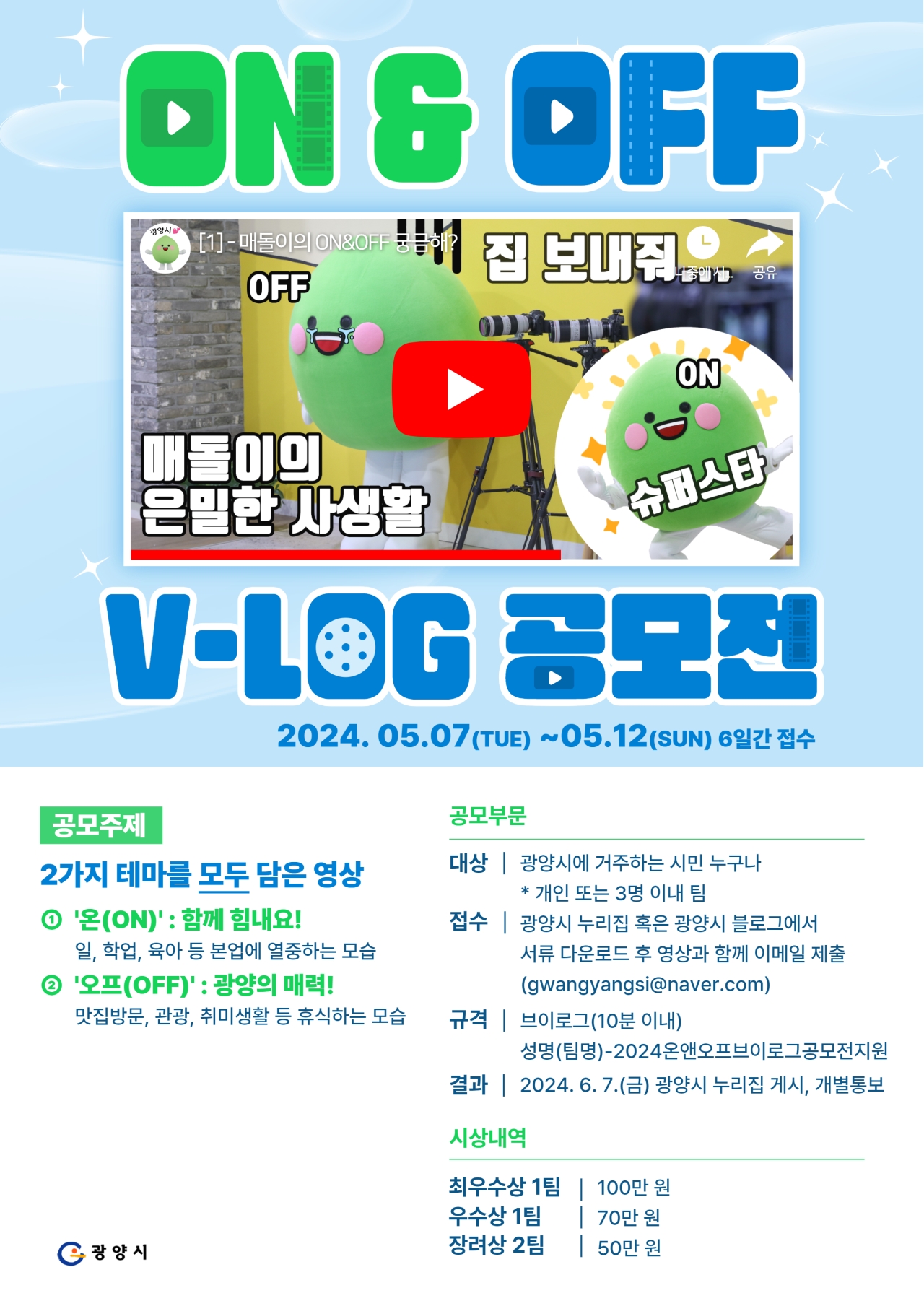 광양시는 5월 12일까지 시민의 일상과 휴식을 함께 공유하는 ‘2024 온앤오프 브이로그 공모전’을 개최한다고 밝혔다.