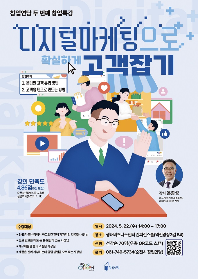 순천시(시장 노관규)는 오는 22일 생태비즈니스센터 컨퍼런스홀에서 청년창업기반을 다지기 위한 ‘디지털마케팅으로 확실하게 고객잡기’창업 특강을 진행한다.