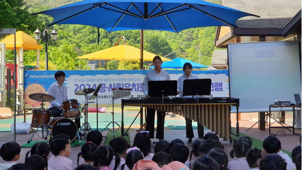 광양교육지원청과 연계해 11월까지 운영하는 ‘유아 예술꽃 햇살프로그램’은 유아들에게 문화 예술적 경험을 통해 전인적 발달을 지원하고 다양한 타악기들을 접하며 경험해 볼 수 있도록 기획됐다.