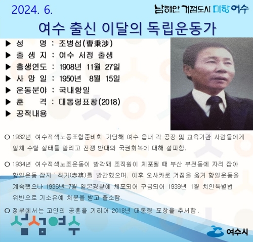 여수시-여수 출신 이달의 독립 운동가 홍보물 여수시(시장 정기명)가 6월의 독립운동가로 여수 서정 태생 ‘조...