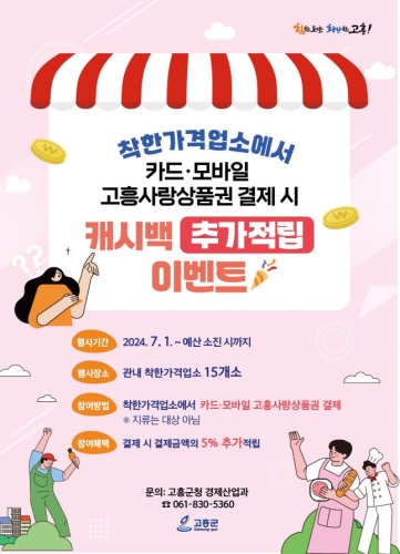 고흥군-캐시백 추가적립 이벤트 홍보물 고흥군(군수 공영민)은 7월부터 착한가격업소에서 고흥사랑카드·모바일 고...