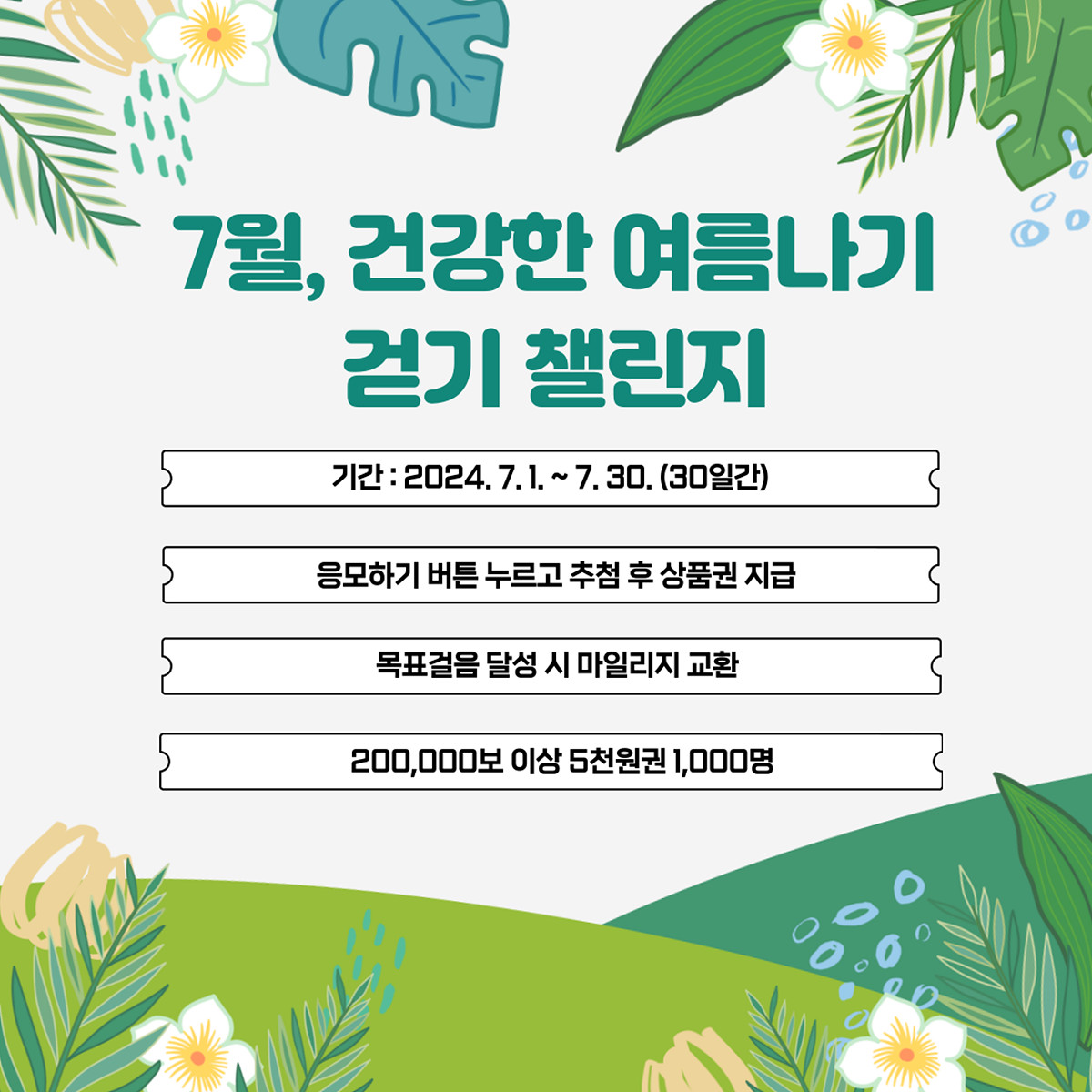 1걸음당 1마일리지가 적립되며, 1일 최대 8천 마일리지가 누적된다. 챌린지 기간 중 20만 보 이상을 걸으면 모바일 문화상품권 5천 원권 응모가 가능하고 추첨을 통해 1,000명에게 지급할 예정이다.