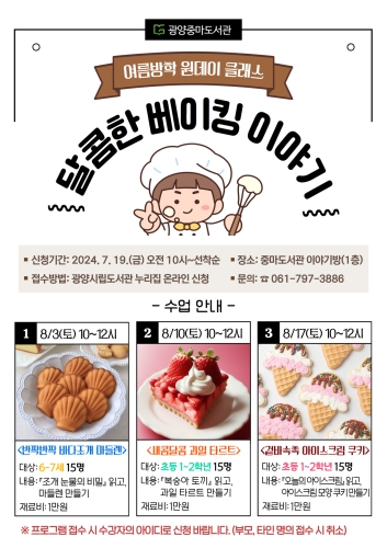 광양시-광양중마도서관, ‘2024년 여름방학 원데이 클래스’ 수강생 모집 홍보물 광양중마도서관에서 여름과 관...
