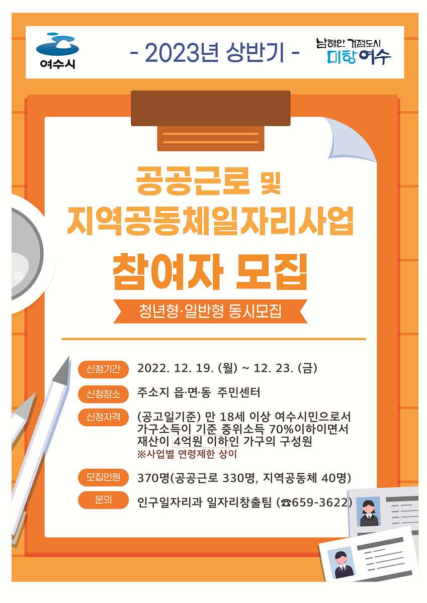 여수시(시장 정기명)가 ‘2023년 상반기 공공일자리사업’ 참여자를 모집한다.