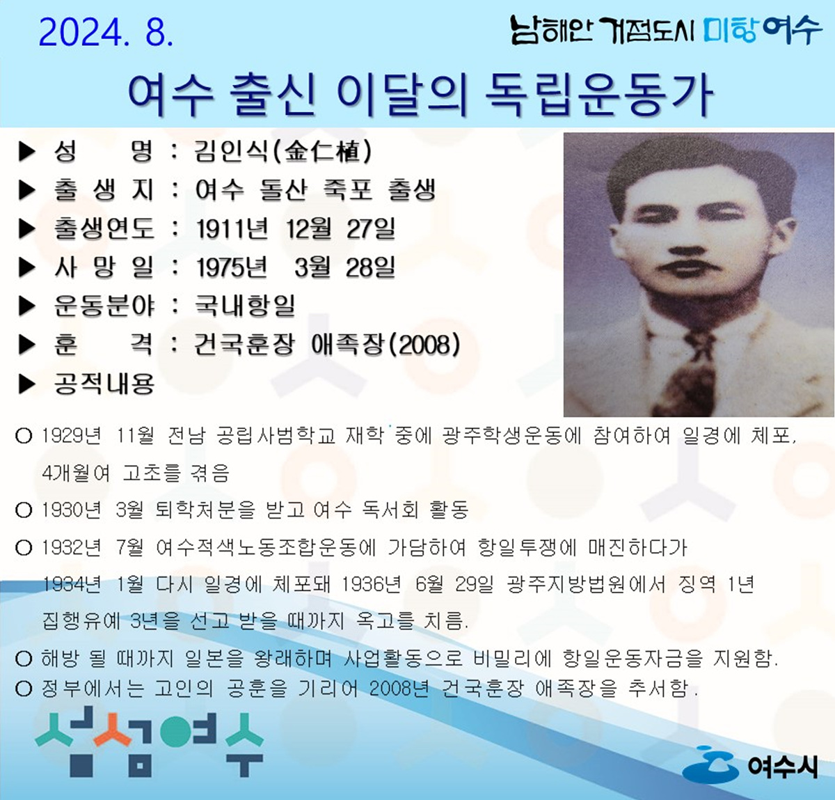 여수시(시장 정기명)가 8월의 독립운동가로 여수 돌산 죽포 태생의 ‘김인식(金仁植) 선생’을 선정했다.
