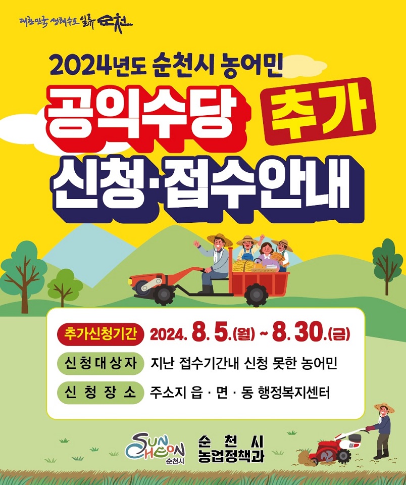 순천시(시장 노관규)는 오는 5일부터 30일까지 농어민 공익수당 수급 자격요건을 갖춘 농어민을 대상으로 추가신청을 접수한다고 밝혔다.