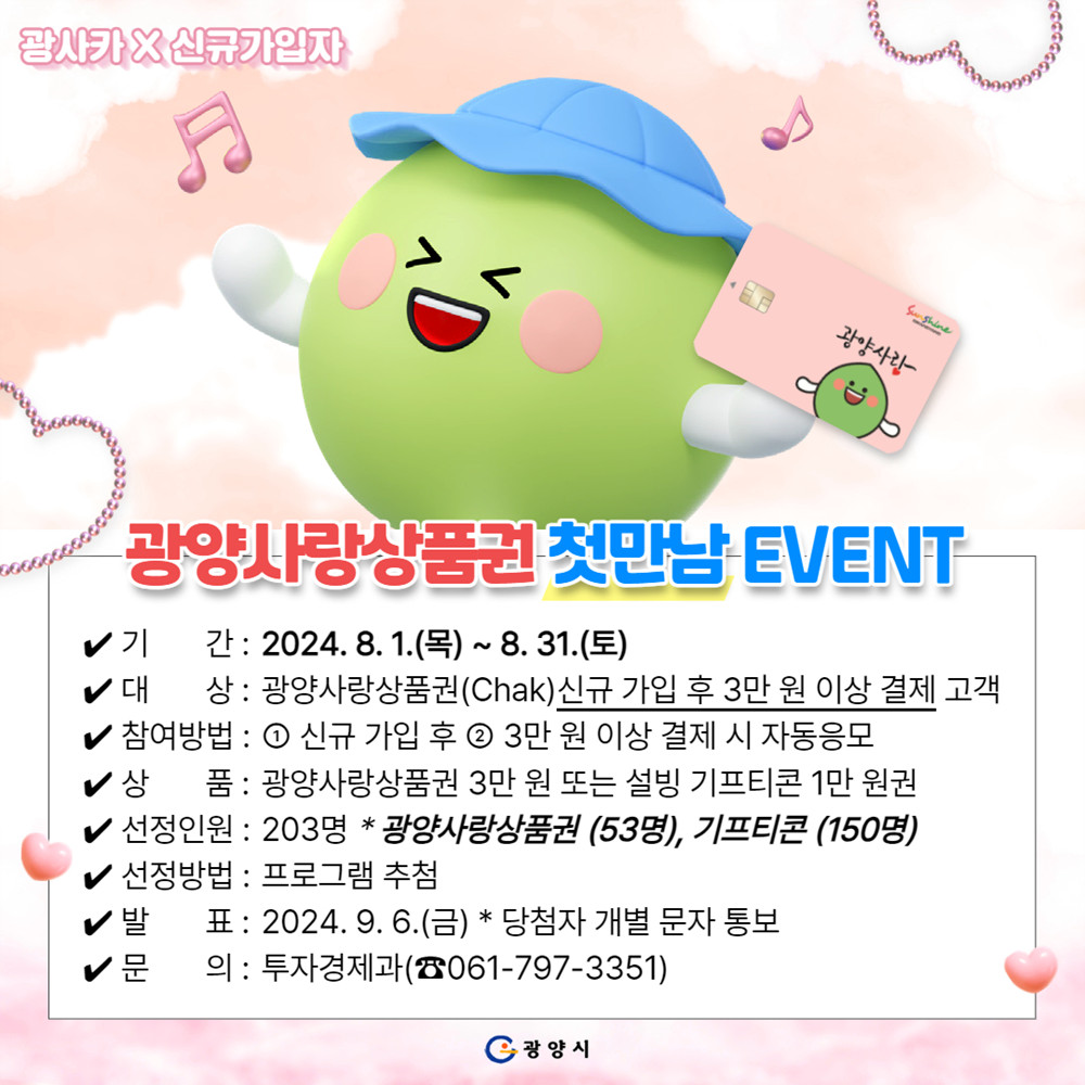 광양시가 광양사랑상품권 신규가입자 유입을 위해 8월 1일부터 31일까지 한 달간 이벤트를 진행한다.