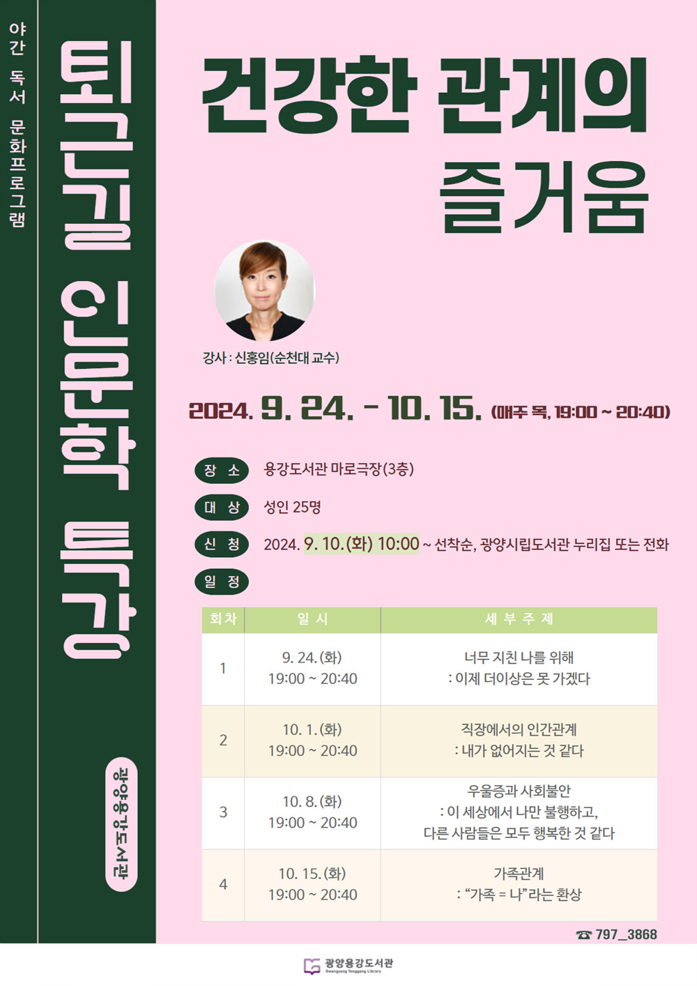 광양용강도서관은 청년층‧직장인의 참여를 유도하기 위해 오는 9월 24일부터 10월 15일까지 매주 화요일 저녁 7시에 마로극장에서 「퇴근길 인문학 특강」을 진행한다.