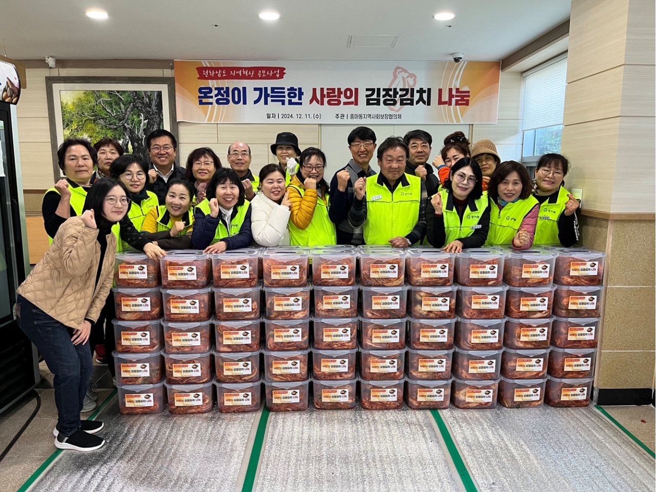 전라남도 지역 사회혁신 공모사업비 478만 원을 확보한 중마동 지역사회보장협의체는 홀몸 어르신, 한부모 가정, 장애 가정 등 복지 사각지대에 놓인 취약계층 150세대를 방문해 행사에서 정성껏 담은 김장김치를 전달했다.