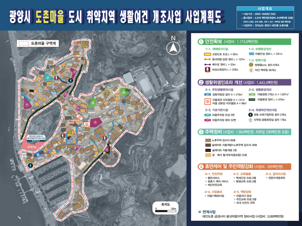 전남에서는 태인동 도촌마을이 유일하게 선정됐다. 광양시는 2025년부터 2029년까지 5개년간 총 40억 원(국비 28억 원, 도비 4억 원, 시비 8억 원)을 투입하며, 2025년 기본계획 및 실시설계 용역에 착수해 2026년부터는 본격적으로 사업을 추진할 계획이다.