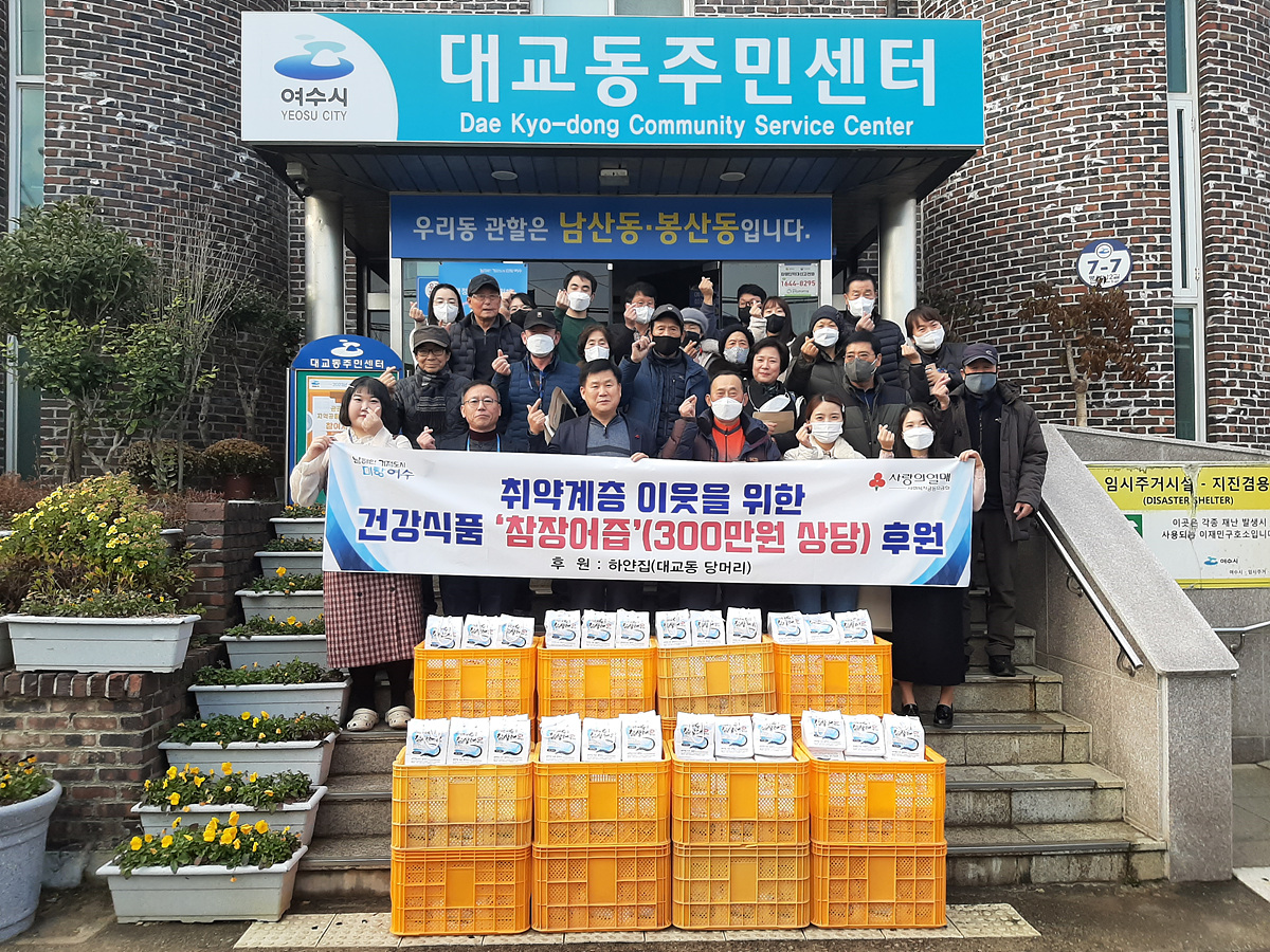 여수시 대교동 하얀집(대표 이인구)이 지난 20일 대교동주민센터를 방문해 어려운 이웃을 위한 300만원 상당의 참장어즙 155세트를 후원했다
