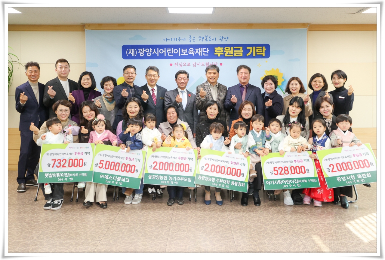 (재)광양시어린이보육재단은 1월 23일, 정인화 광양시장, 이광용 이사장, 기탁자 및 관계자 20여 명이 참석한 가운데 후원금 기탁식을 개최했다. 이번 기탁식에서는 지역사회 단체와 개인들의 정성 어린 후원금 총 1,220만 원이 기탁되며, 어린이를 위한 다양한 보육 사업 추진에 힘을 보탰다.