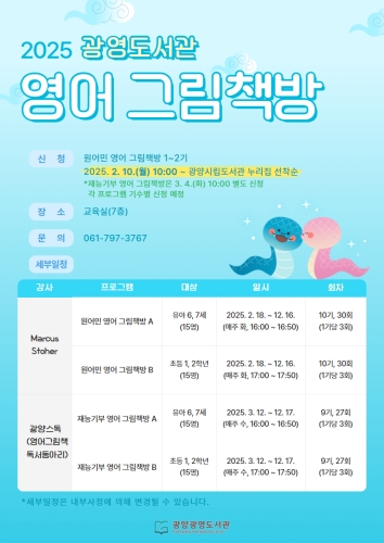 광양시 광양광영도서관이 오는 2월부터 12월까지 ‘영어 그림책방’ 프로그램을 운영한다. ‘영어 그림책방’은 ...