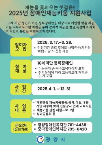 광양시 광양시는 3월 17일부터 28일까지 ‘2025년 장애인 재능키움 지원사업’의 참여자를 모집한다고 밝혔...