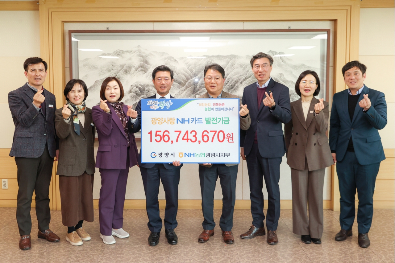 이날 전달식에서 정인화 광양시장은 “NH농협은행과 제휴를 통해 적립된 기금은 지역발전을 위해 필요한 곳에 사용할 계획이며, NH농협은행 광양시지부도 시민과 지역발전을 위해 최선을 다해주길 바란다.”라고 말했다.