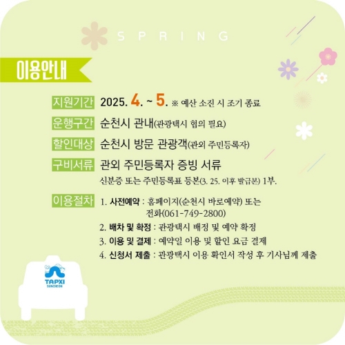 순천시 순천시(시장 노관규)는 오는 4월부터 5월까지 봄맞이 관광객을 위한 순천 관광택시 ‘봄맞이 반값 할인...