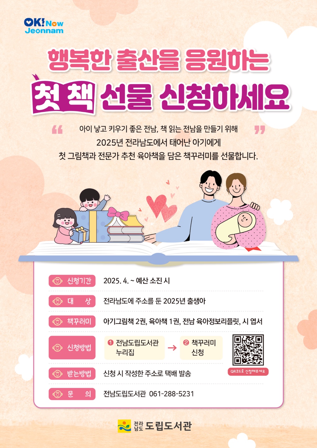 전라남도립도서관은 전남에서 태어나는 아이들이 책과 함께 인생을 시작하도록 2025 행복한 출산을 응원하는 첫 책 선물 사업을 4월부터 시행한다고 밝혔다.