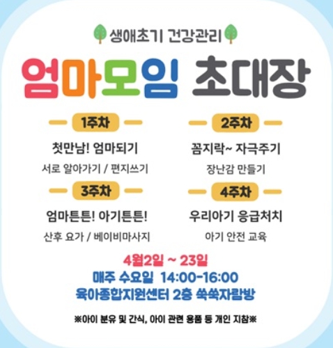 시 관계자는 “산후 우울감과 육아 스트레스로 도움이 필요한 가정이 늘고 있는 상황에서 ‘엄마모임’ 프로그램이 산모 간의 정서적 교류와 함께 양육에 대한 다양한 정보를 공유할 수 있는 소통의 장이 될 것”이라며, “육아 자신감을 향상시킬 수 있는 좋은 기회로, 더 많은 가정에 기회가 돌아갈 수 있도록 ‘엄마모임’ 프로그램을 지속적으로 운영할 계획이다”고 말했다.