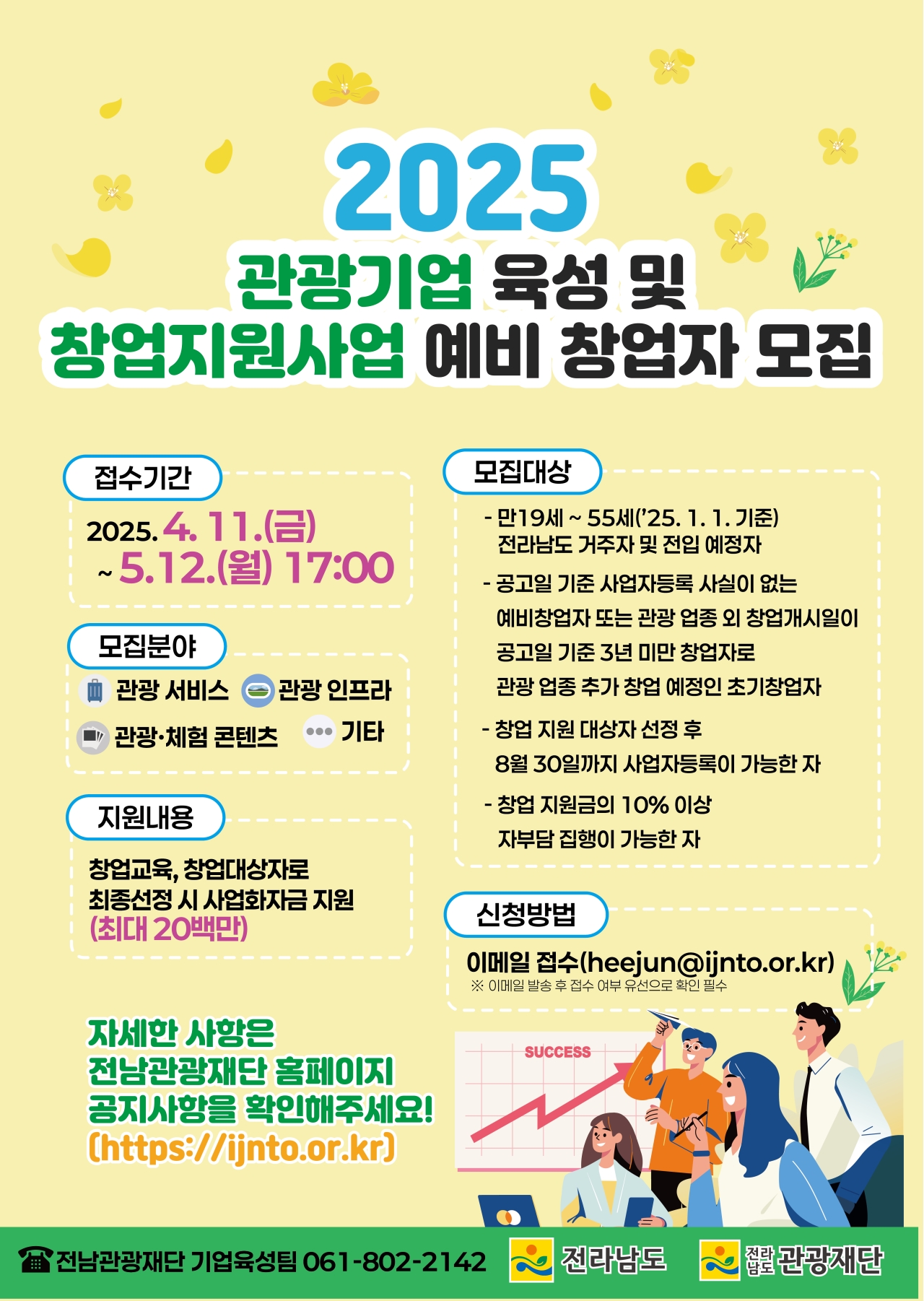 전라남도는 전남관광재단과 함께 관광 분야 참신한 아이디어와 실행력을 갖춘 예비창업자를 발굴·지원하기 위한 ‘2025 관광기업 육성 및 창업 지원사업’ 참가자를 5월 12일까지 한 달여간 모집한다고 밝혔다.