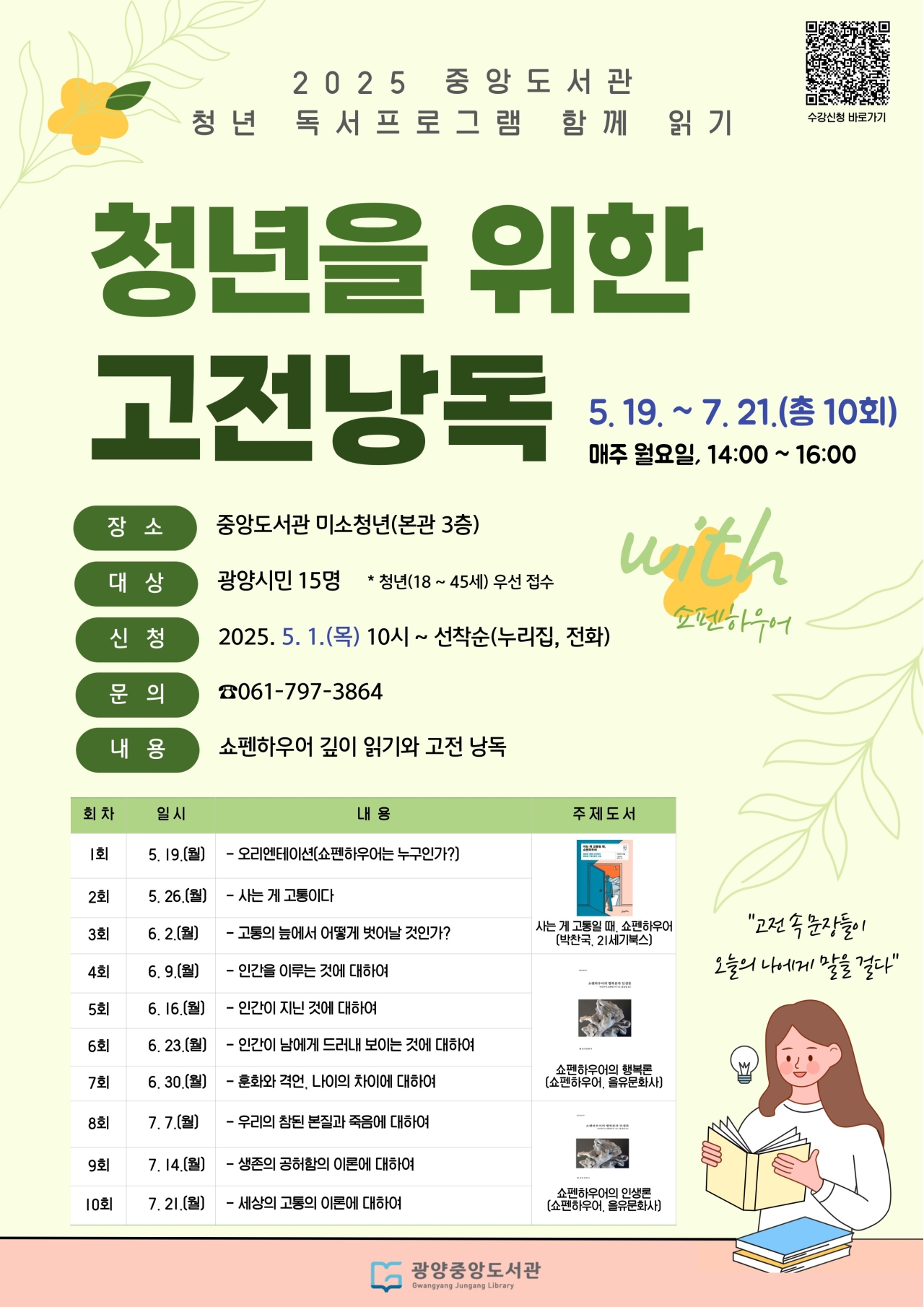 남수향 중앙도서관팀장은 “이번 프로그램은 청년들이 혼자 하는 독서에서 벗어나 서로의 생각을 나누고 연결되는 경험을 통해 독서의 즐거움과 의미를 새롭게 발견할 수 있도록 기획했다”며 “광양시의 많은 청년들이 고전을 매개로 한 깊이 있는 독서 여정에 함께하길 바란다”고 말했다.