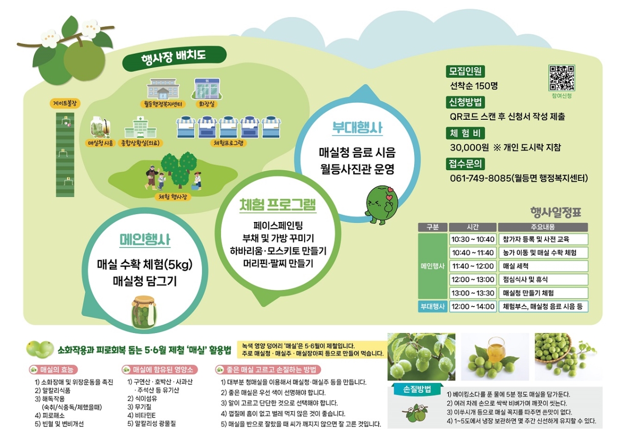체험행사는 사전 접수를 통해 선착순 150명을 모집한다. 행사 참여 신청은 월등면 행정복지센터로 전화 신청(061-749-8085) 및 QR코드로 신청하면 된다.