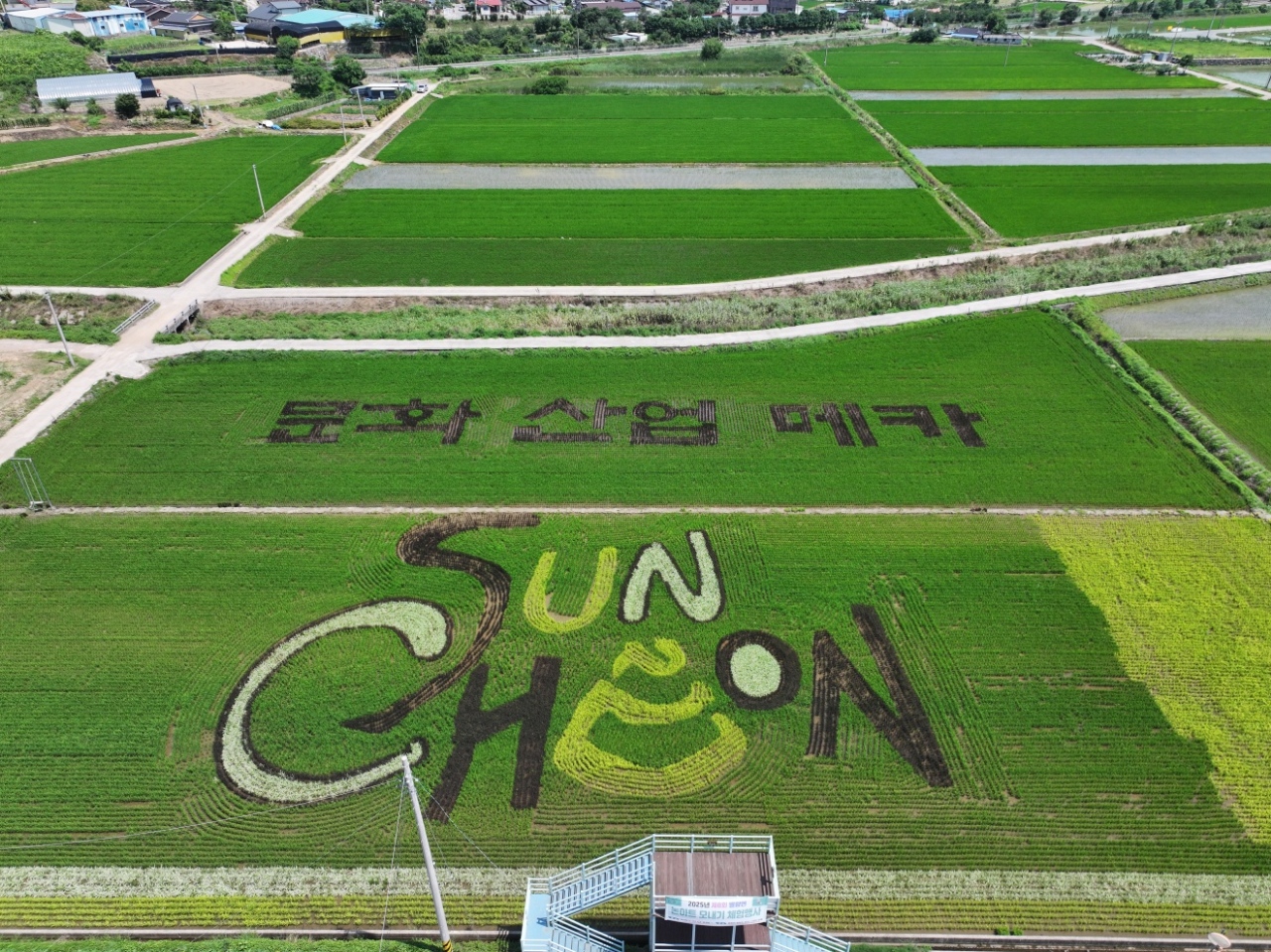 약 3개월이 흐른 현재, 키가 자라고 색이 뚜렷해진 유색벼들은 순천시 문화 산업을 알리는 슬로건과 순천시 CI로고를, 다른 한편에는 순천시의 시조인 흑두루미를 바라보는 가족들의 모습이 담겨, 별량면과 순천만의 정겨운 시골 풍경을 선명하게 나타내고 있다.