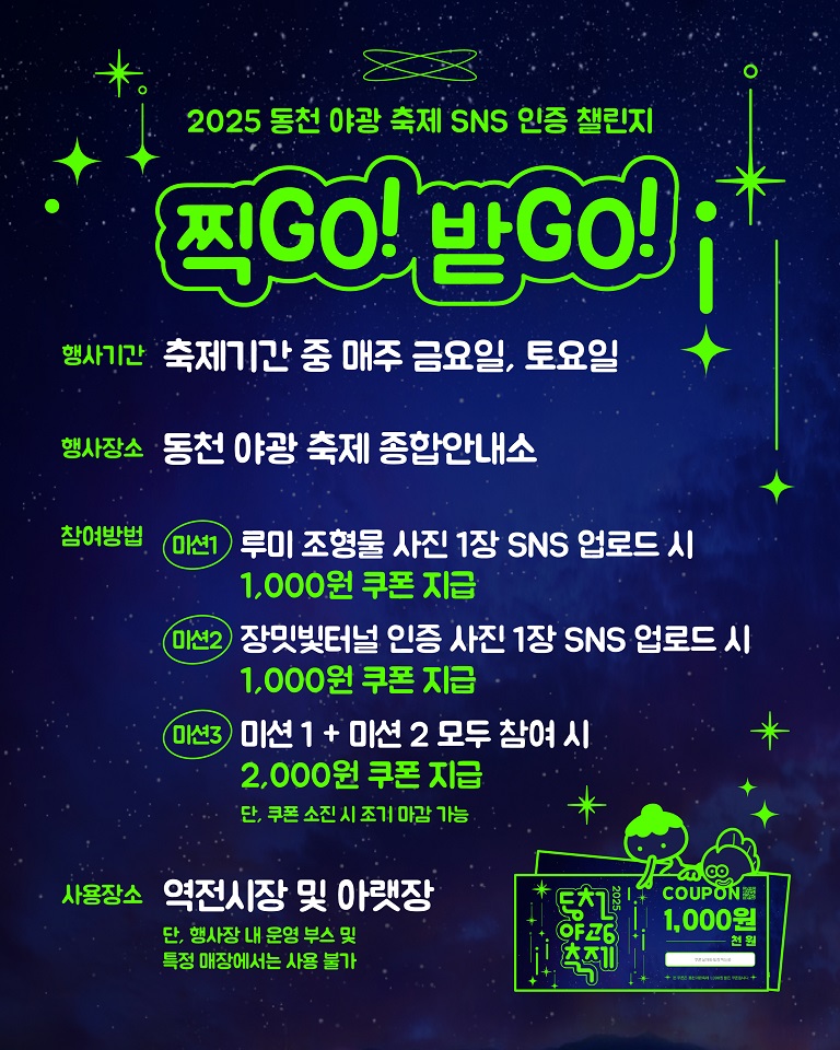 매주 금요일, 토요일에 동천야광축제를 방문하는 방문객들에게 SNS 인증챌린지 ‘찍 GO!, 받 GO!’를 통해 할인 쿠폰을 제공한다. 챌린지는 동천변의 루미 조형물, 장밋빛터널 사진을 찍어 SNS에 업로드한 뒤, 축제 종합안내소에서 이를 인증하면 완료된다.