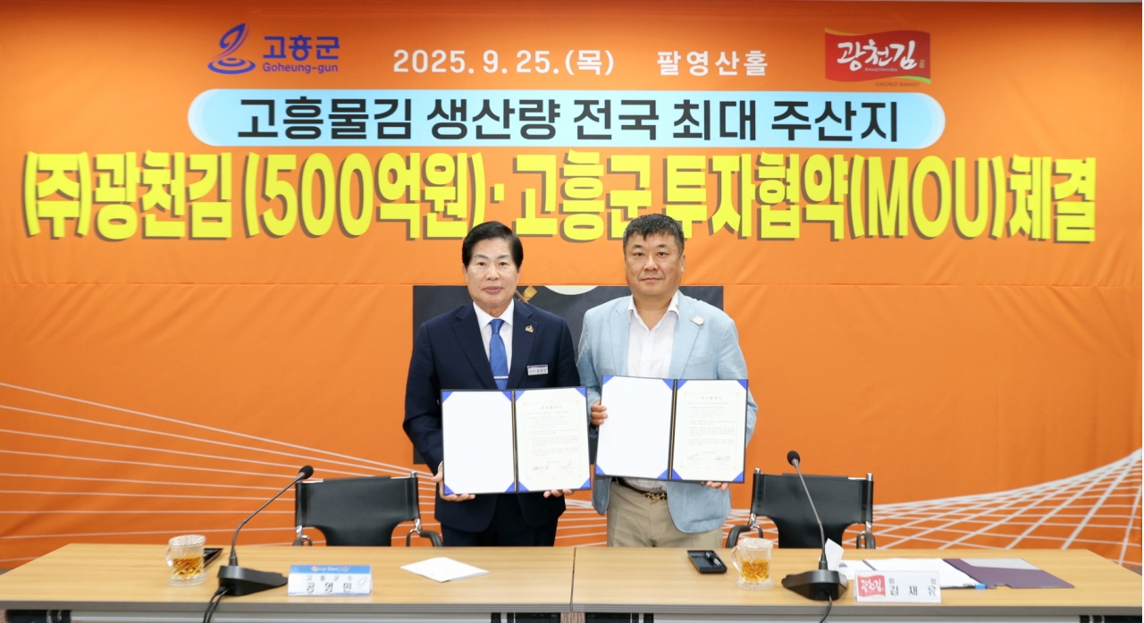 고흥군(군수 공영민)은 지난 25일 군청 팔영산홀에서 국내 김 산업 선도기업인 ㈜광천김(대표 김재유)과 500억 원 규모의 민간개발 투자협약(MOU)을 체결했다고 밝혔다.