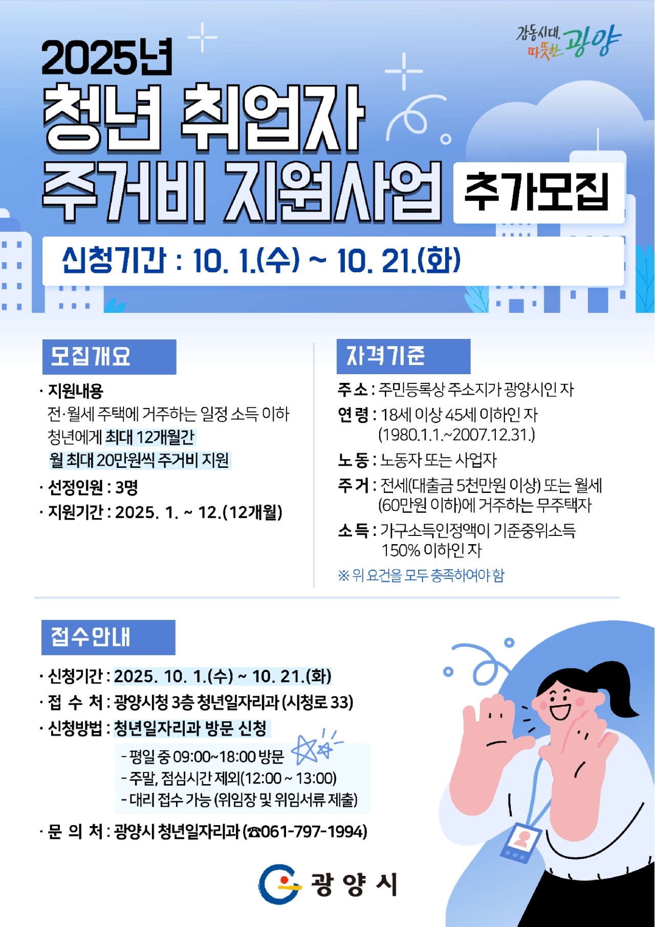 광양시(시장 정인화)는 청년들의 주거 안정을 위해 10월 1일부터 21일까지 ‘2025년 청년 취업자 주거비 지원사업’ 추가 모집을 진행한다고 밝혔다.