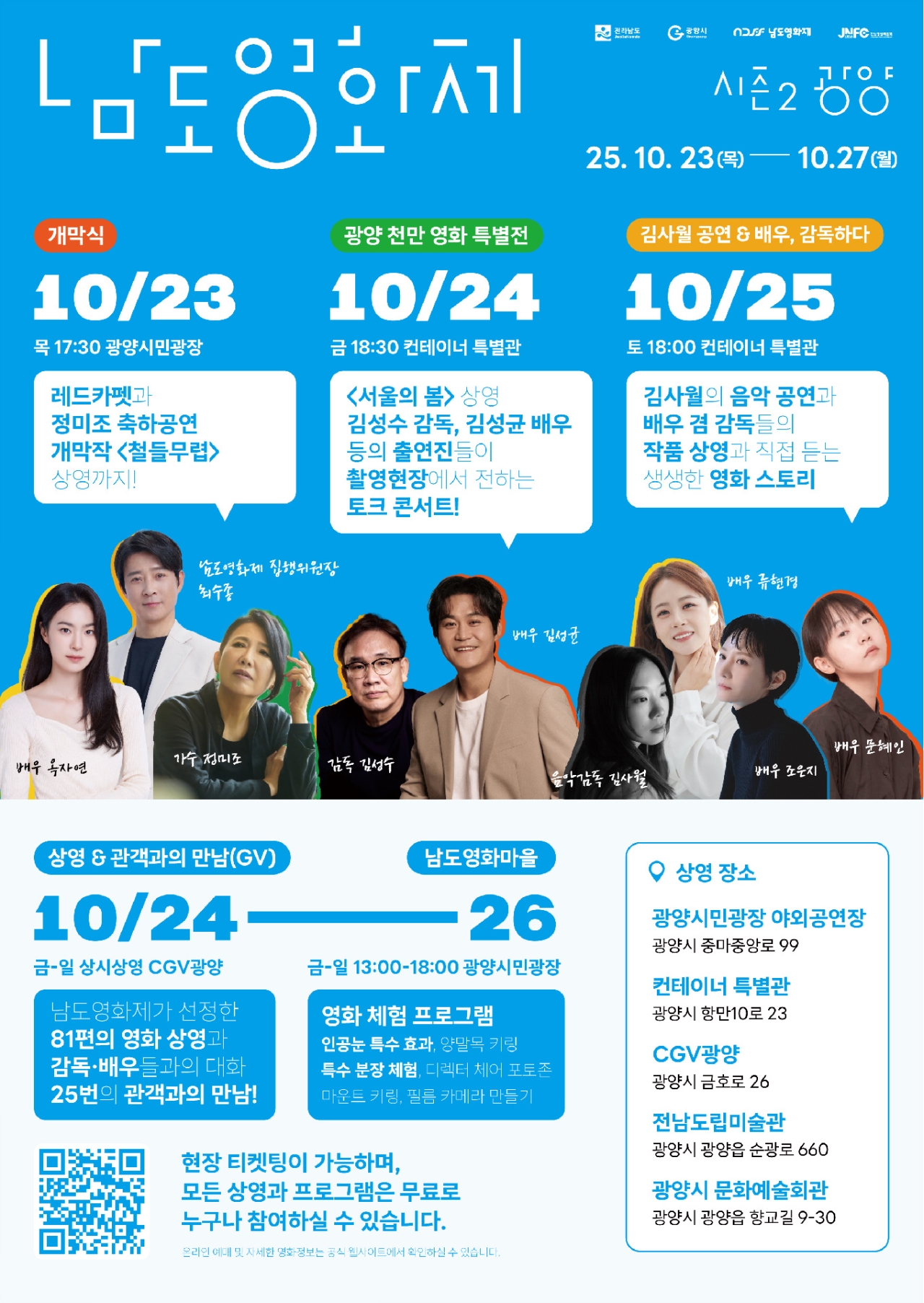 [남도영화제 시즌2 광양]은 10월 23일(목)부터 27일(월)까지 CGV광양, 전남도립미술관, 광양시문화예술회관, 광양시민광장, 컨테이너 특별관(스타인벡코리아 광양항) 등 광양시 일대에서 열린다.