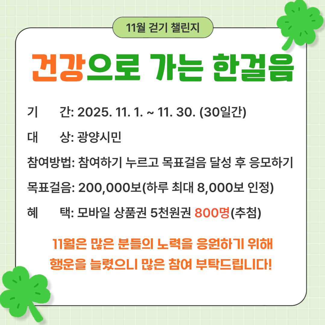 광양시는 지역 주민의 건강생활 실천을 돕기 위해 11월 1일부터 30일까지 모바일 걷기 앱 「워크온」에서 ‘건강으로 가는 한걸음 11월 걷기 챌린지’를 운영한다고 밝혔다.