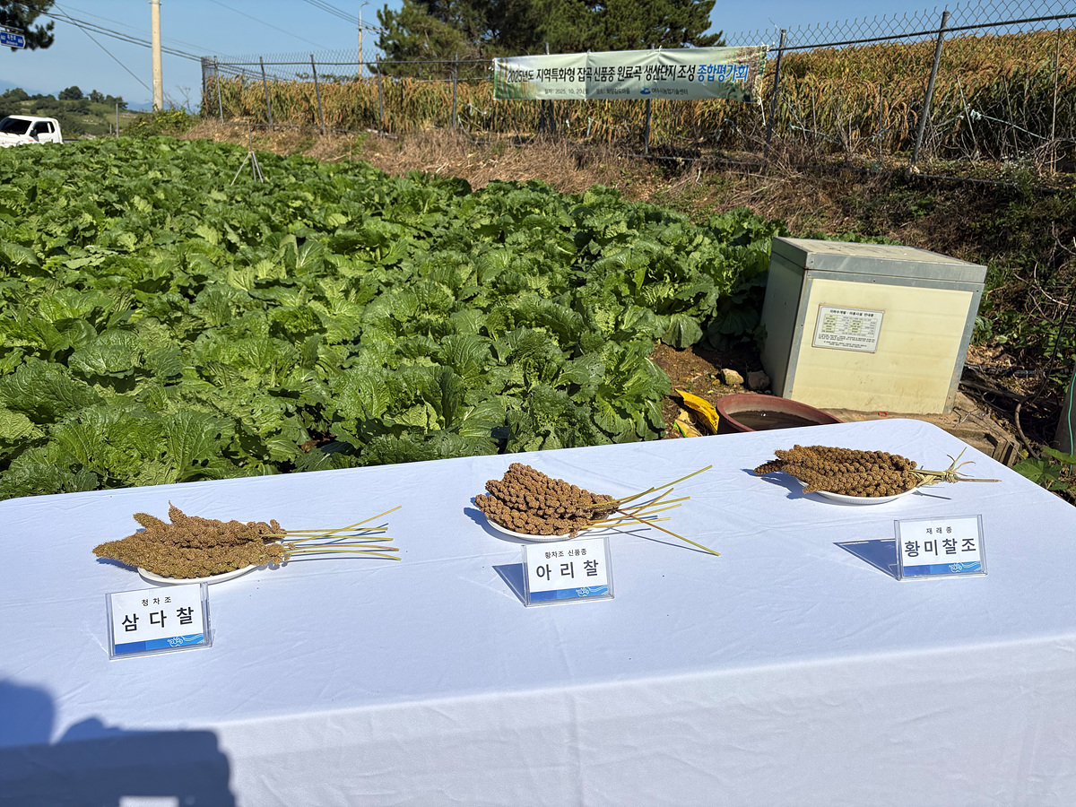 평가회는 기존 재배 품종인 청차조 ‘삼다찰’과 재래품종 ‘황미찰조’, 신품종 ‘아리찰’의 이삭 현장 연시로 시작됐으며 참석자들은 ‘아리찰’ 재배 포장에 직접 들어가 생육 상태와 품질을 확인했다.