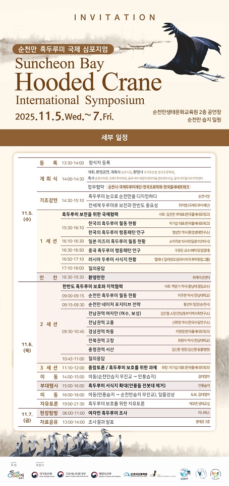 순천시(시장 노관규)는 오는 11월 5일부터 7일까지 3일간 순천만생태문화교육원과 순천만습지 일원에서 「2025 순천만 흑두루미 국제심포지엄」을 개최한다고 밝혔다.