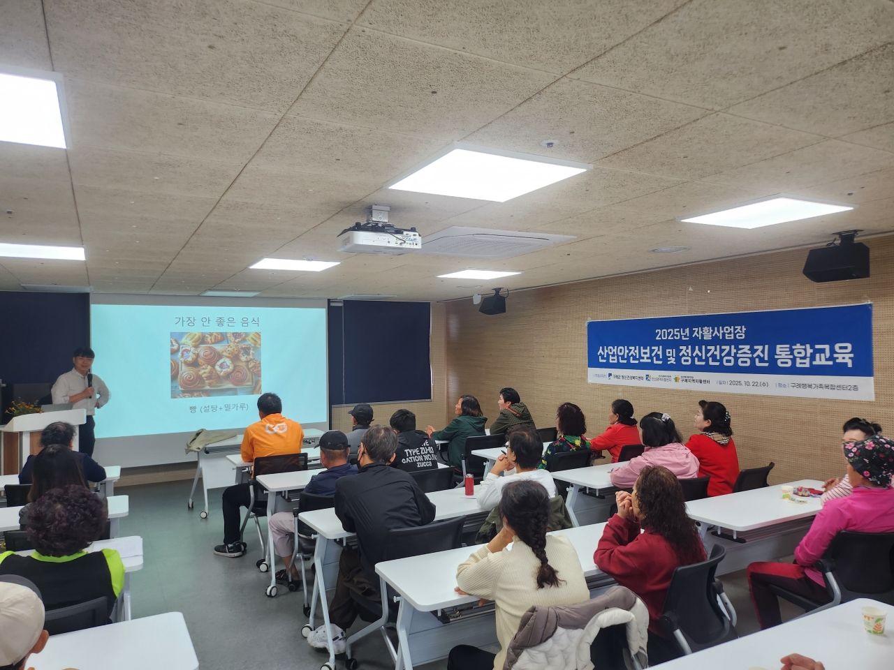 구례지역자활센터는 지역사회의 희망을 만들어가는 자활근로 사업단 참여자들의 건강하고 안전한 근로환경 조성을 위해 노력하고 있습니다. 이의 일환으로 2025년 10월 22일(수), 참여자 약 37명을 대상으로 산업안전보건교육 및 정신건강증진 통합교육을 성공적으로 실시하였다.