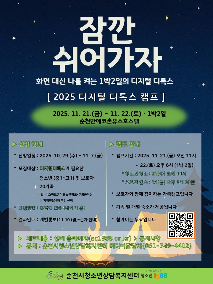 순천시(시장 노관규)는 청소년의 건강한 미디어 사용습관 형성과 가족 간 유대감 강화를 위해 「2025년 청소년 디지털 디톡스 캠프」를 오는 11월 21일부터 22일까지 순천만에코촌 유스호스텔에서 1박 2일 간 운영한다.