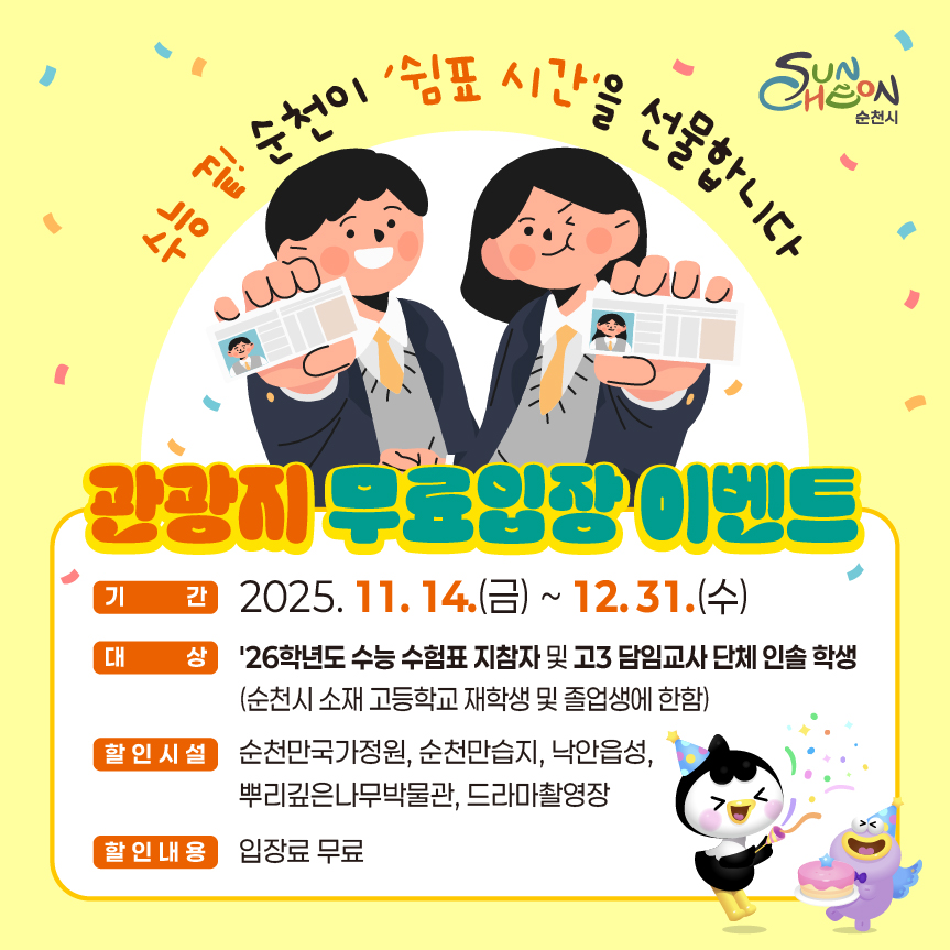 순천시(시장 노관규)는 2026학년도 대학수학능력시험을 마친 수험생들이 시험의 긴 여정을 마무리하고 잠시 숨을 고를 수 있도록, 11월 14일부터 12월 31일까지 주요 관광지를 무료로 개방한다.