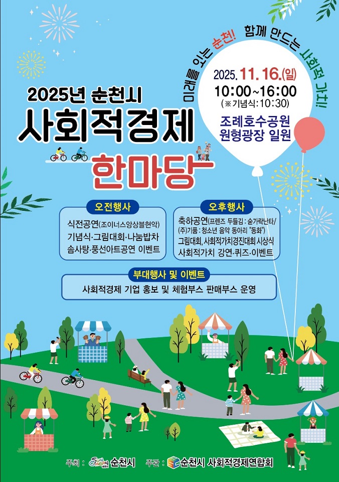 순천시(시장 노관규)는 오는 16일 조례호수공원 원형광장 일원에서 ‘미래를 잇는 순천! 함께 나누는 사회적 가치’를 주제로 “2025년 순천시 사회적경제 한마당”을 개최한다고 밝혔다.