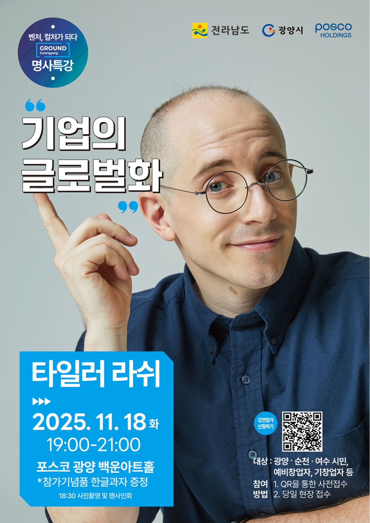 광양시는 11월 18일(화) 오후 7시 백운아트홀에서 열리는 ‘2025년 제3회 광양 스타트업 콘서트’에 방송인 타일러 라쉬를 초청해 글로벌 특강을 진행한다고 밝혔다.