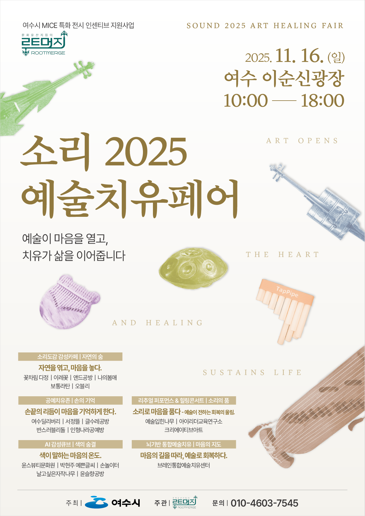 여수시(시장 정기명)는 오는 11월 16일 이순신광장에서 ‘소리 2025 예술치유페어’를 개최한다.