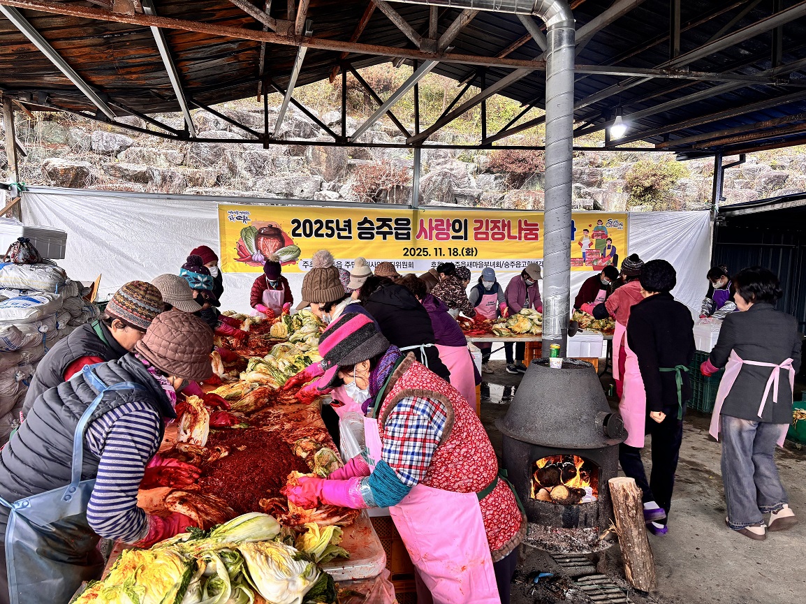 순천시 승주읍(읍장 강진숙)은 지난 18일 겨울나기에 어려움을 겪는 이웃들에게 따뜻한 겨울을 선물하기 위해 지역단체가 함께하는 ‘사랑의 김장나눔 행사’를 추진했다고 밝혔다.